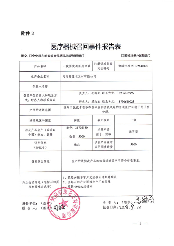 豫北卫材针对哈尔滨一次性医用口罩召回说明